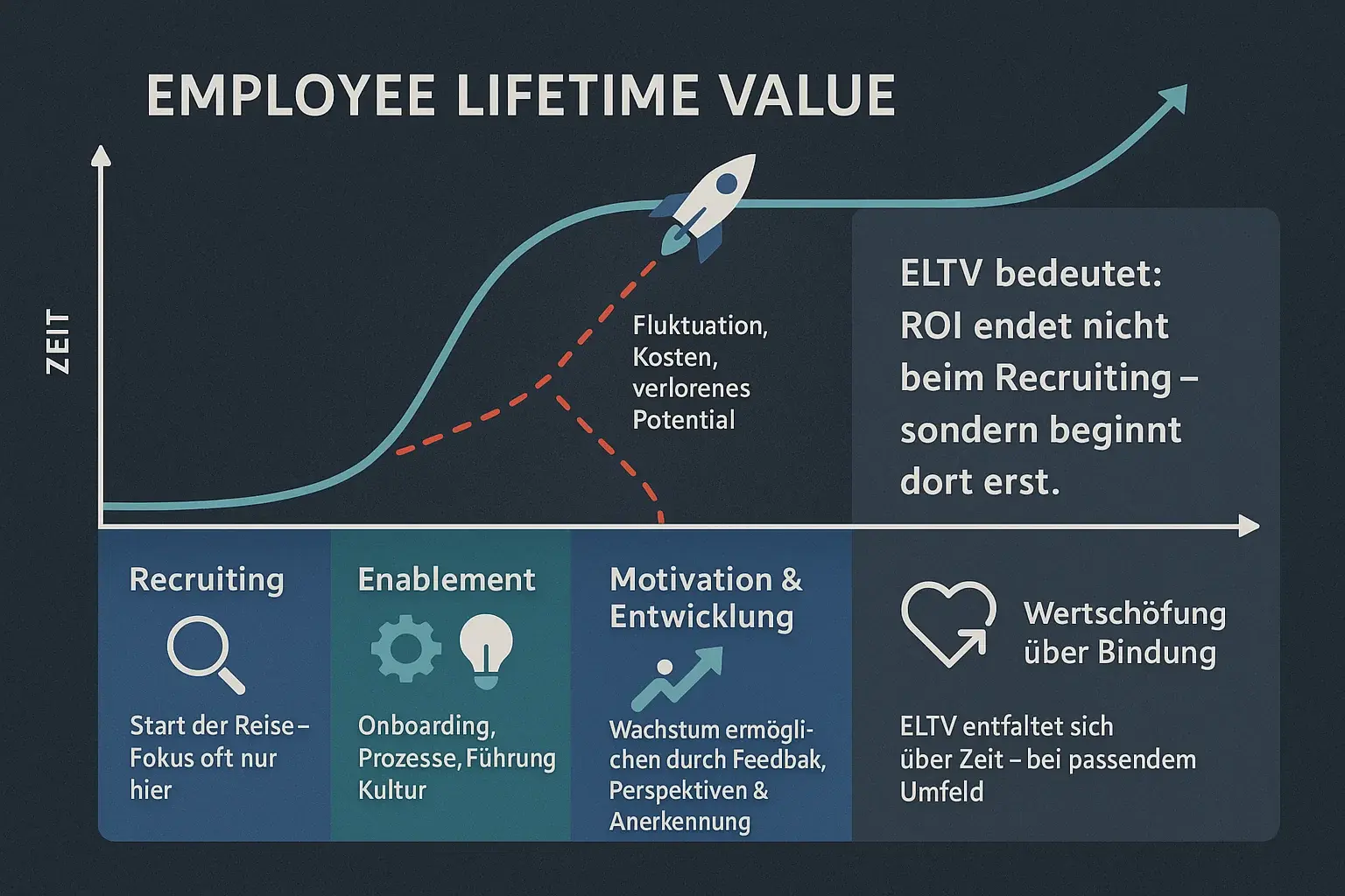 Nicht jeder Mitarbeitende entfaltet seinen Wert sofort. Der ELTV steigt mit der Zeit – vorausgesetzt, das Umfeld stimmt. Gutes Onboarding, persönliche Entwicklungsmöglichkeiten, konstruktives Feedback und kulturelle Integration sind keine „Soft Topics“, sondern knallharte Werttreiber.